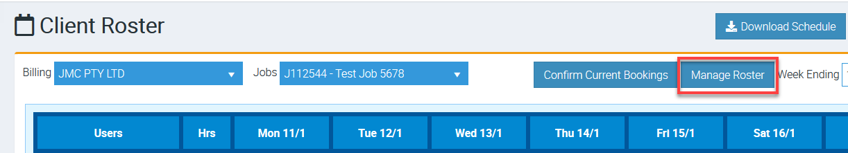 2. The Client Roster screen appears and you can filter to Billing Customer and Job which displays the assigned users booked for that job.