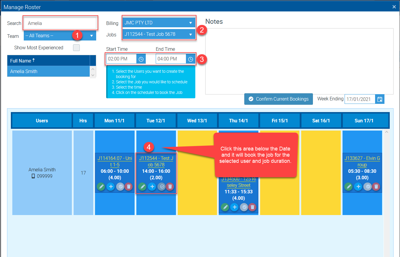 In this example below, we selected Job J112544 and created a booking for Amelia on Tuesday 12 January. If you want to book it on a different day, just repeat the steps but click the area below the corresponding date.