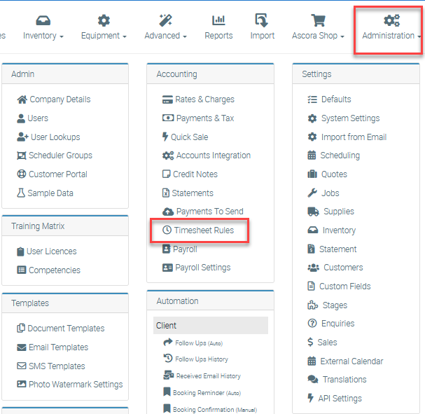 1. To enable Timesheet Rules, go to Administration → Timesheet Rules.