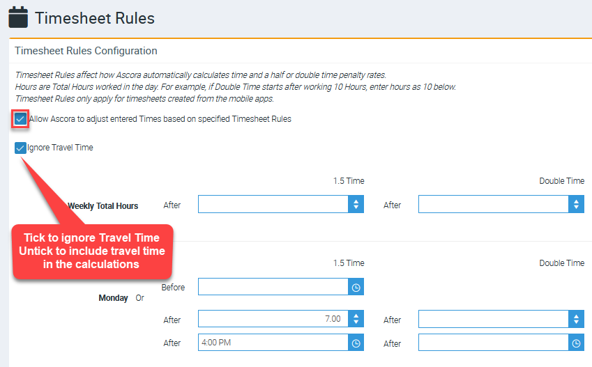 2. Tick the box beside “Allow Ascora to adjust entered Times based on specified Timesheet Rules.”