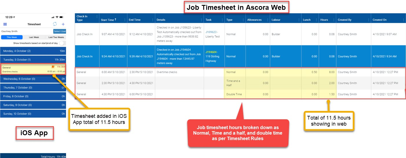 1. The following image is an example of timesheet hours added in iOS App total of 11.5 hours and shown in Ascora web as Normal, Time and a Half, and Double time as per Timesheet Rules applied.