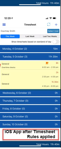 2. After timesheet rules are applied automatically, the updated timesheet calculation will be synched down to the iOS App to reflect the exact breakdown shown in web such as how much hours is general, Time and a Half, and Double Time.