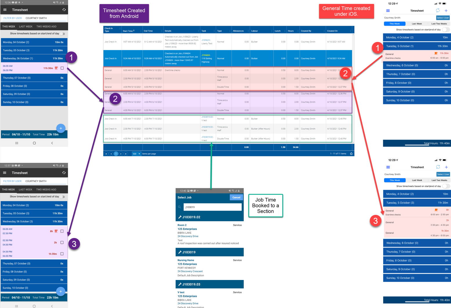 Refer to the image below showing timesheets created in iOS and Android app