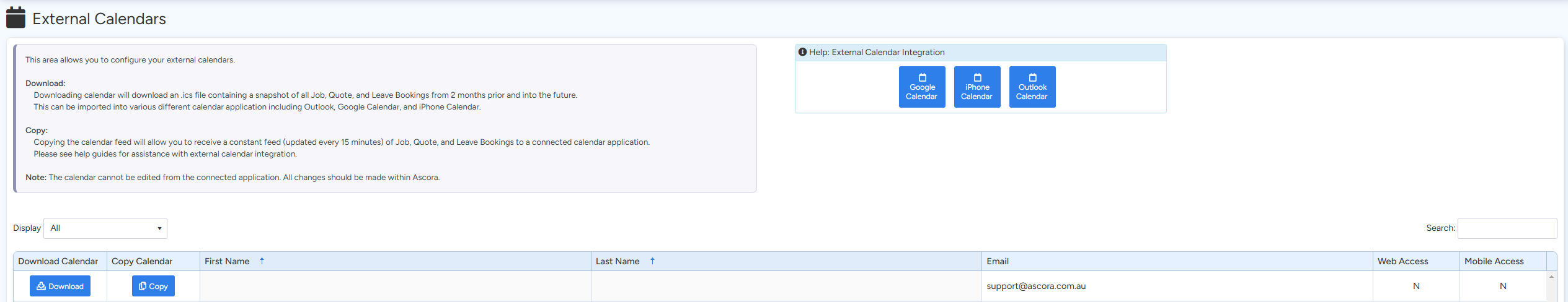 If you want automatic updates, use the Copy feature to sync your calendar feed. This ensures that any changes made in Ascora will reflect in your external calendar every 15 minutes.