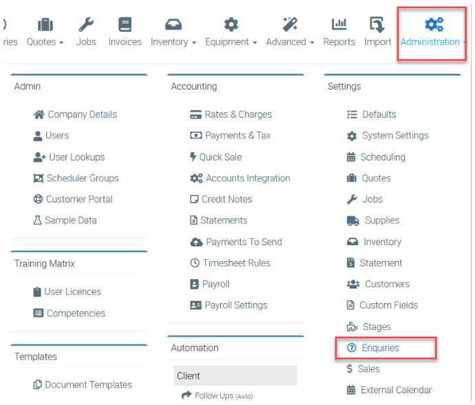 1. Go to Administration → Enquiries.