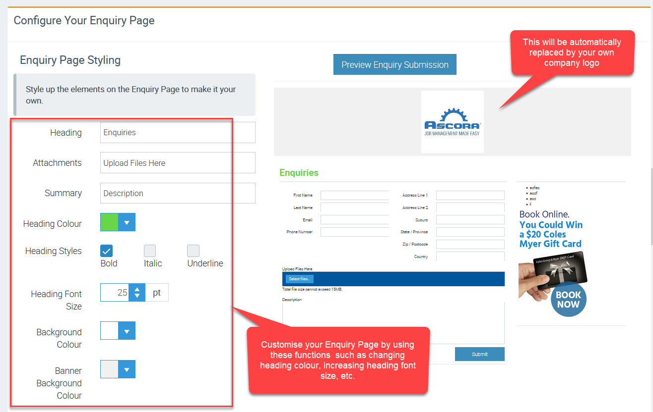 3. Configure your Enquiry Page by personalising or customising the details such as heading, summary, as well as changing the heading colours and background colours.