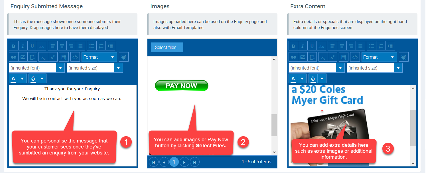 4. Personalise your Enquiry Submitted Message and add images if necessary.