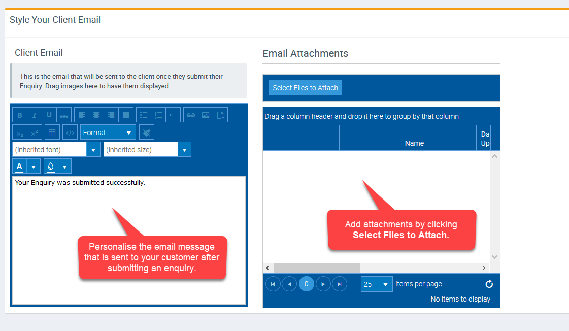 5. Personalise the email message that will be sent to your customers once they've submitted an Enquiry from your website.