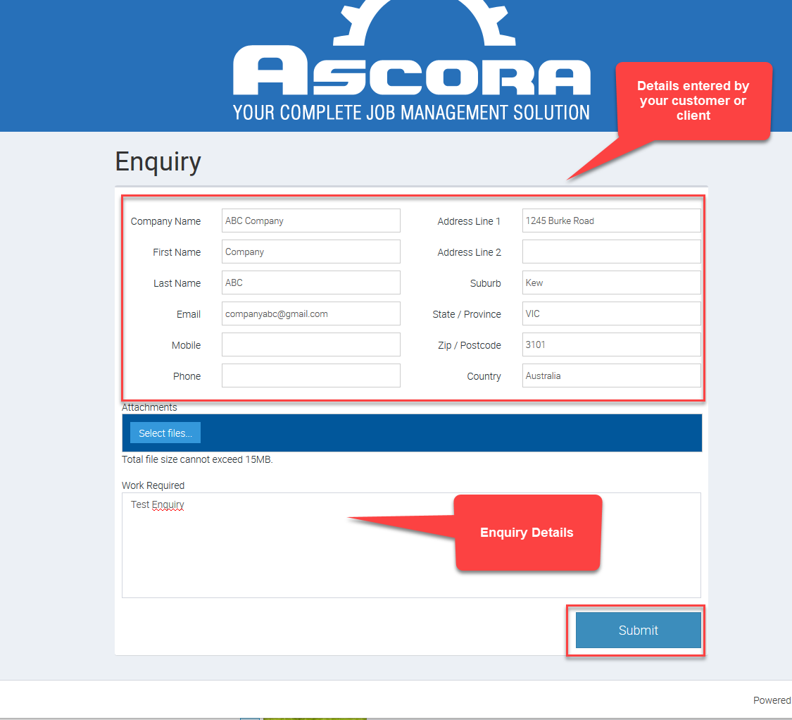 - Customer query details will flow through to Ascora Enquires page
