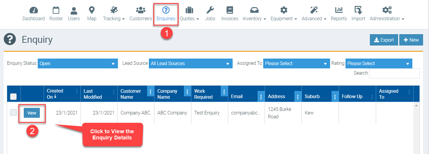 2. In Ascora, go to Enquires and locate your customer enquiry and click View to access the details.