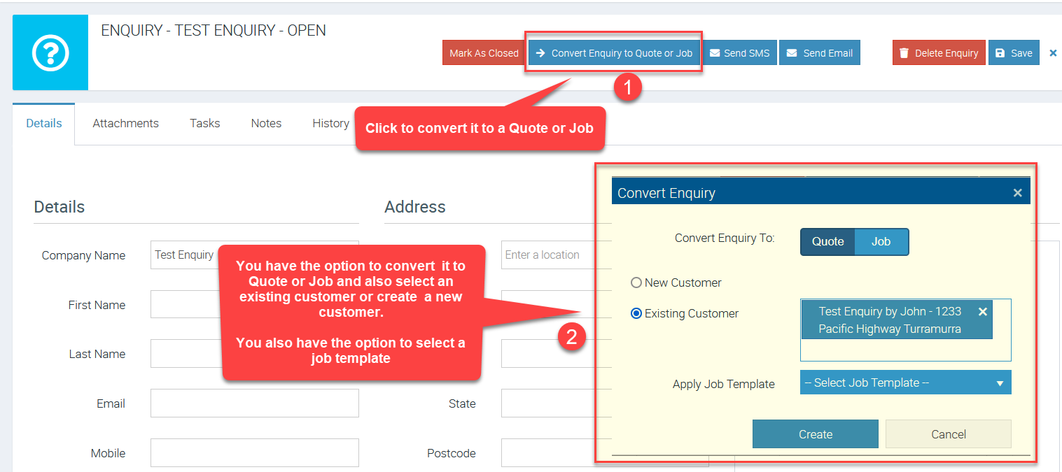 To convert enquiry click on Convert Enquiry to Quote or Job and you'll have the options to select Quote or Job, select existing customer or create a new customer as well as select a job template.