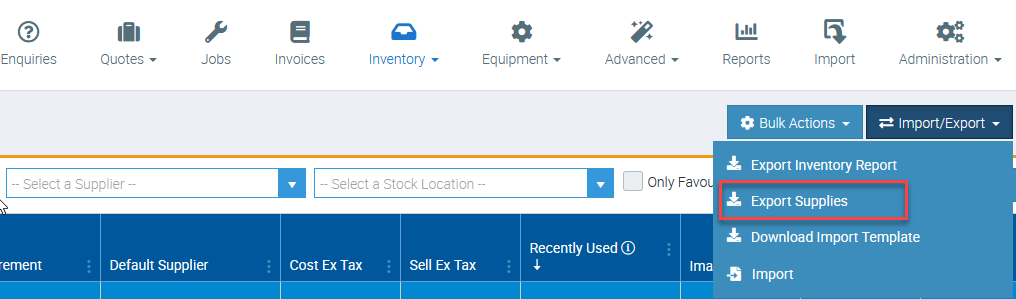 1. Go to Inventory → Supplies → Import/Export then select Export Supplies.