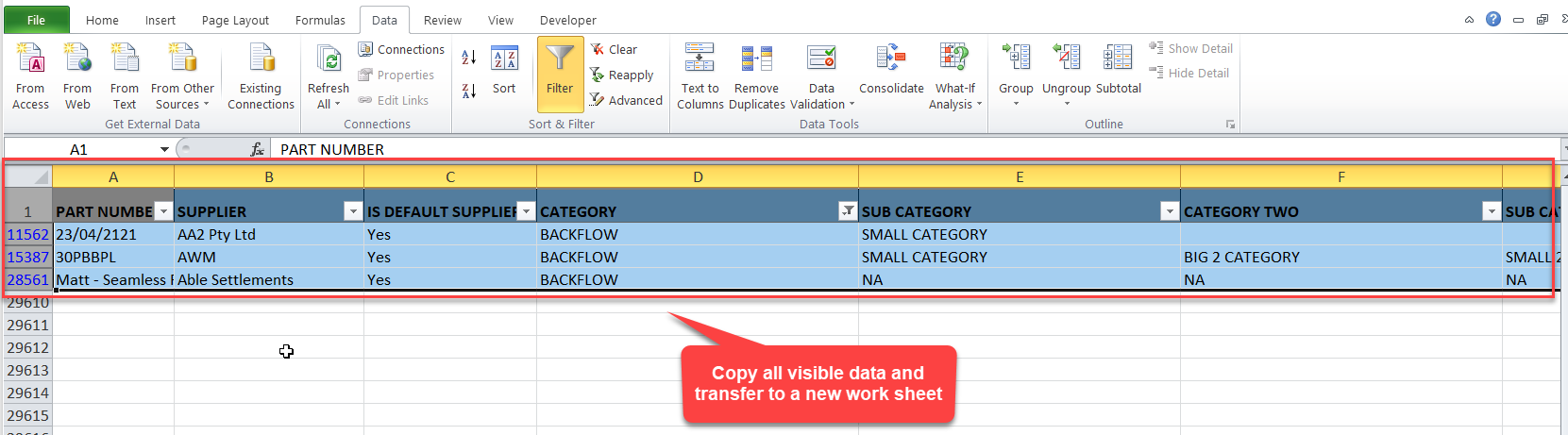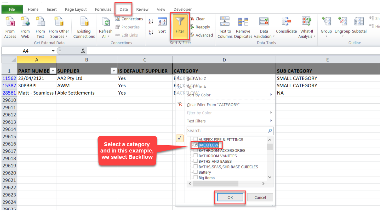 3. With the Excel file opened, click on Data → Filter → and select the category of supplies with markup you need to update.