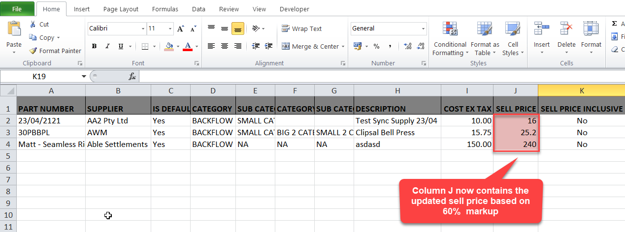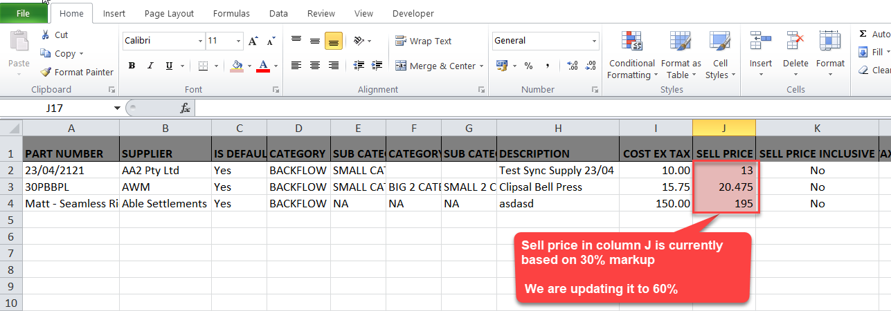 In this example, our fist item has a sell price of $10.2 which is 50% markup. To update it to 60% markup, we can calculate by $10.00 X 60% + Cost Ex tax = $16.00. If you're using formulas to calcuate the new markup, make sure to paste the data as values prior to importing.