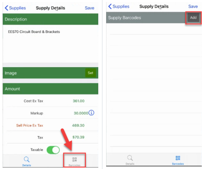 2. Tap Barcode located at the bottom right part of the screen then tap Add.