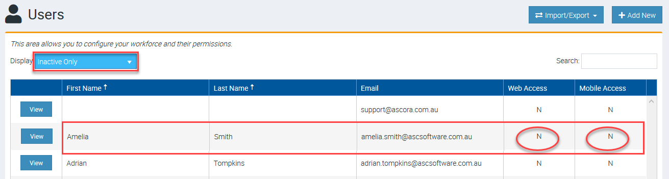 4. Filter the users and select Inactive and you can immediately see the user in the list with an indication of No Web Access and No Mobile Access.