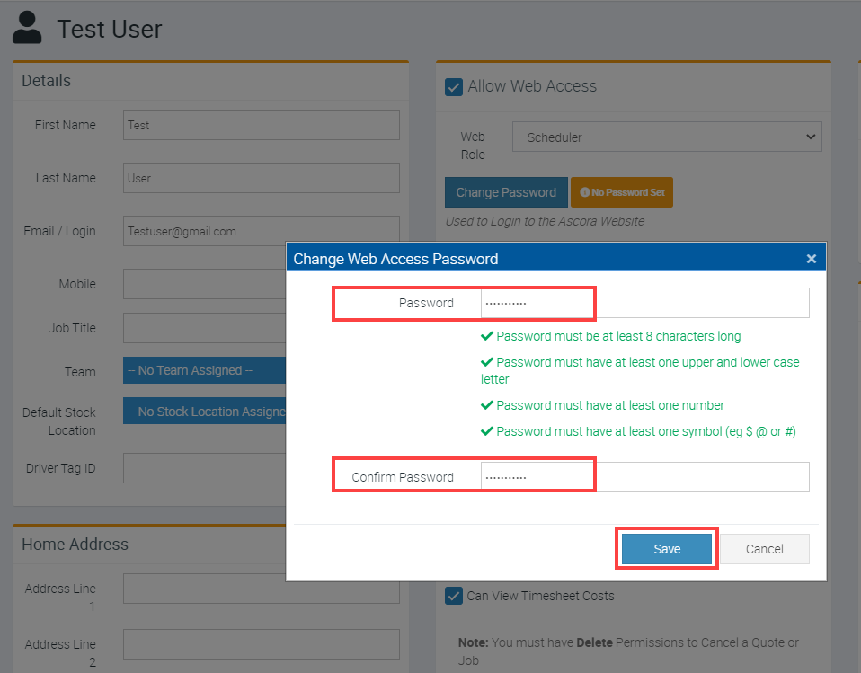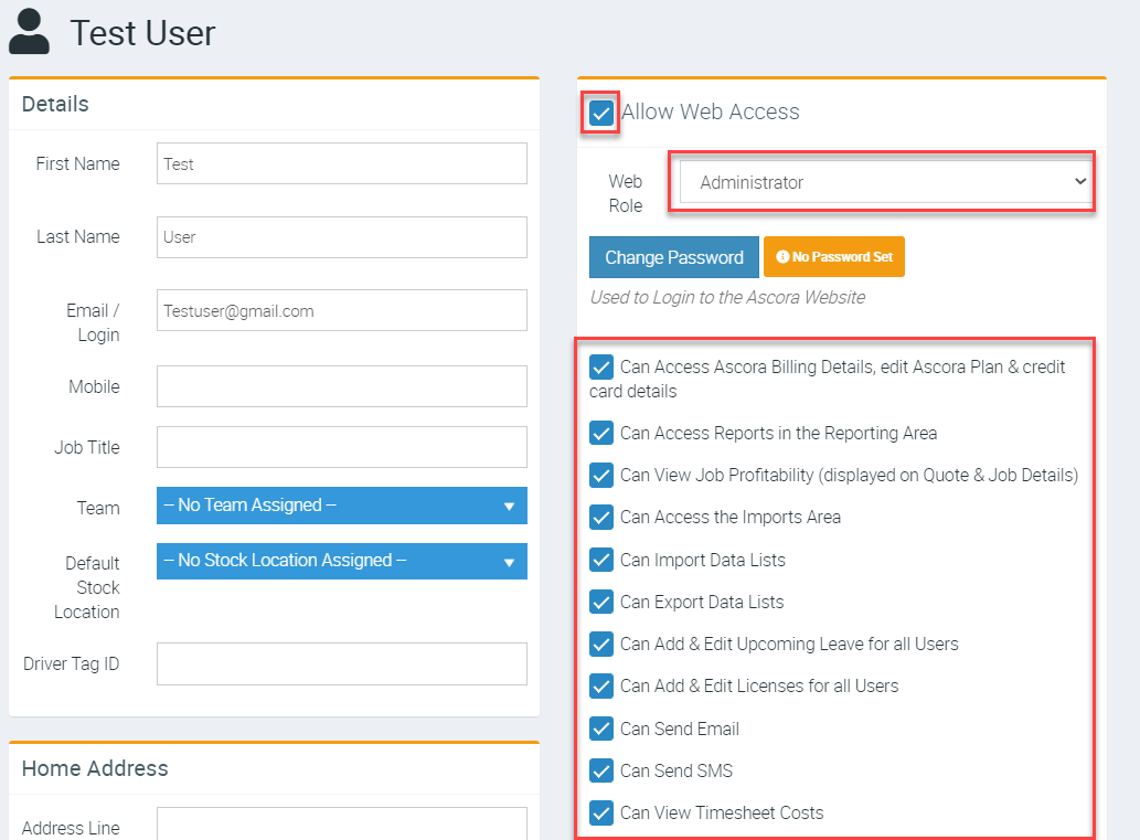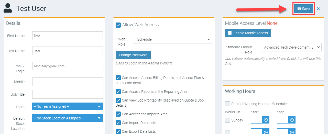 3. Allow web access by ticking the box beside Allow Web Access and assign a role whether Administrator, Scheduler, or Supervisor.