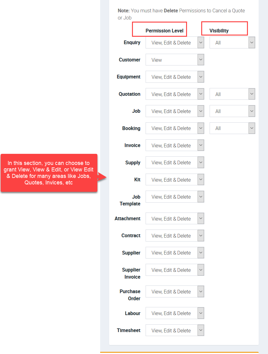 4. In the following section, you can adjust permission levels such as user having the ability to view invoices but unable to delete or a user with access to view jobs but unable to edit and delete.