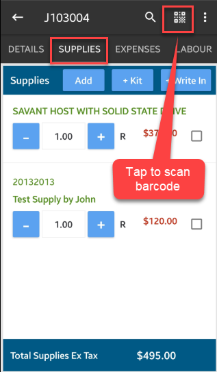 With Android Mobile App, you can do it by opening a job, then tap Supplies tab and tap on the QR icon as indicated in the image below.