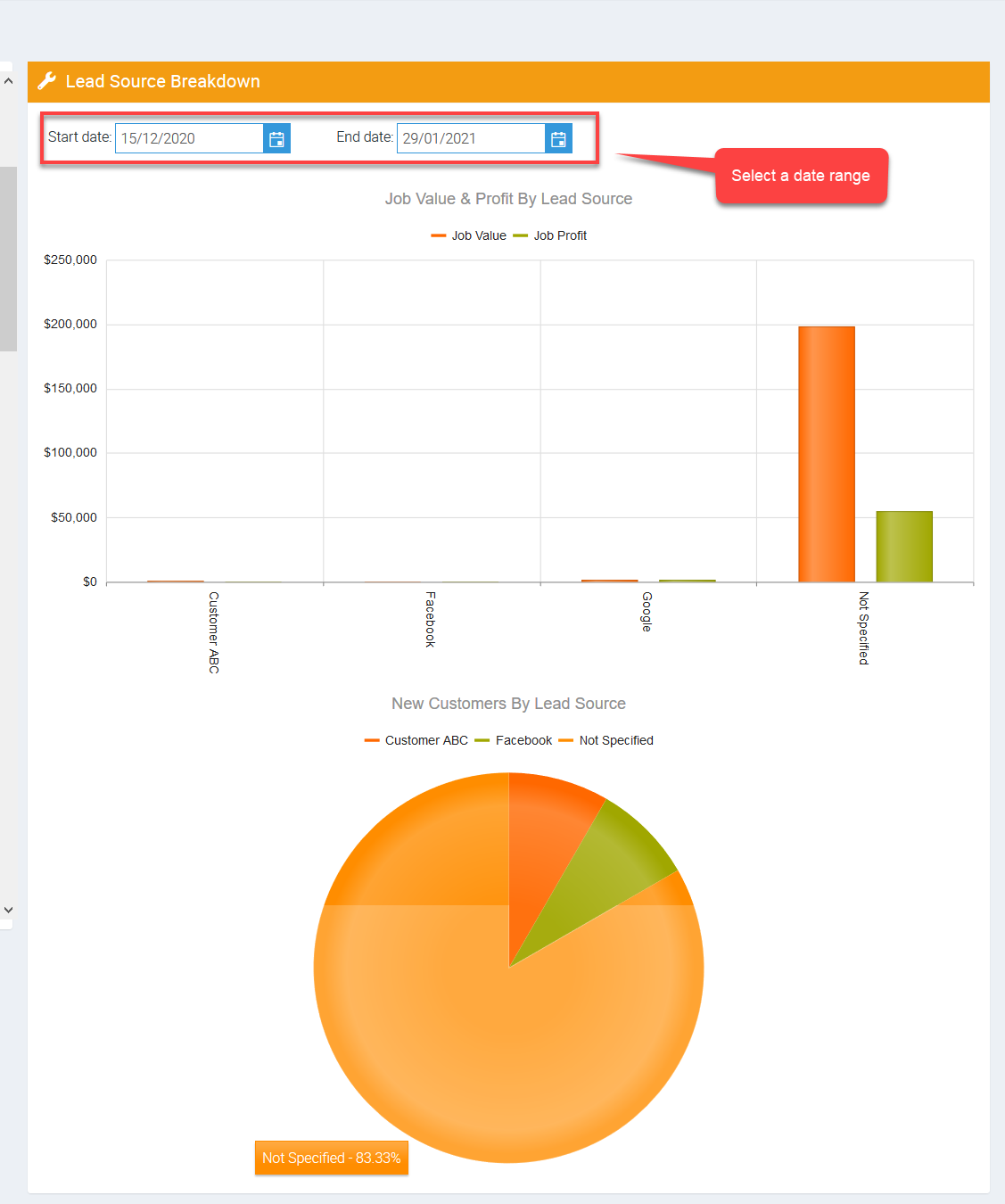 2. Select a date range and you can see an overview of job value and job profit based on lead sources. You can also see a pie showing the percentage of each lead source.